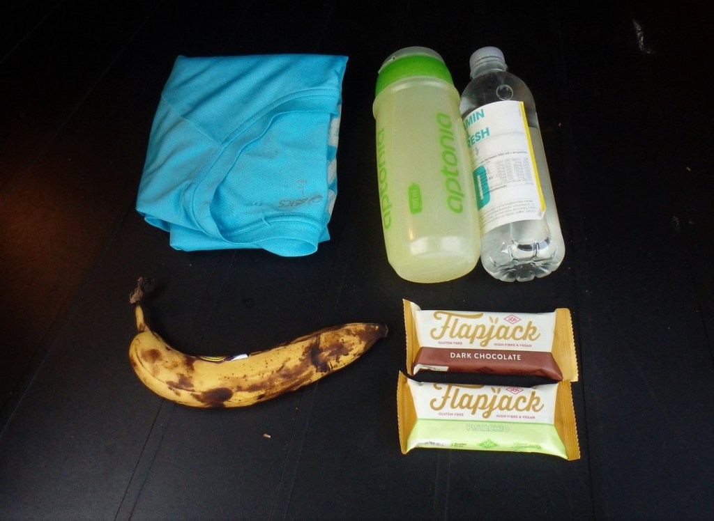 На пункте питания оставил один банан, два флэп джэка (лучше сникерса, но тоже не идеальны для меня), бутылку с изотоником и водой. Энергии, кстати, не хватило. Вероятно, напряженная рабочая неделя и то, что нормально не выспался накануне сказалось. Майку бросил на случай если выйдет солнце и станет жарко, но в результате бегал всё время в кофте с длинным рукавом.