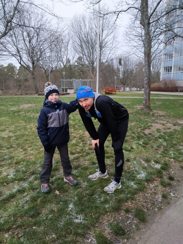 День старта. Погода -2 и почти нет ветра. Можно сказать идеальные условия. Молодым у нас везде дорога и первым бежит свой километр ребенок. Отдал ему свои часы на которых выставил расстояние в 1 км. Бежал с ним за компанию в качестве разминки. 700 метров бежали медленно и на последних 300 максимально ускорились. Как видно на фотографии у юного атлета техника бега идеальная. Молодец!