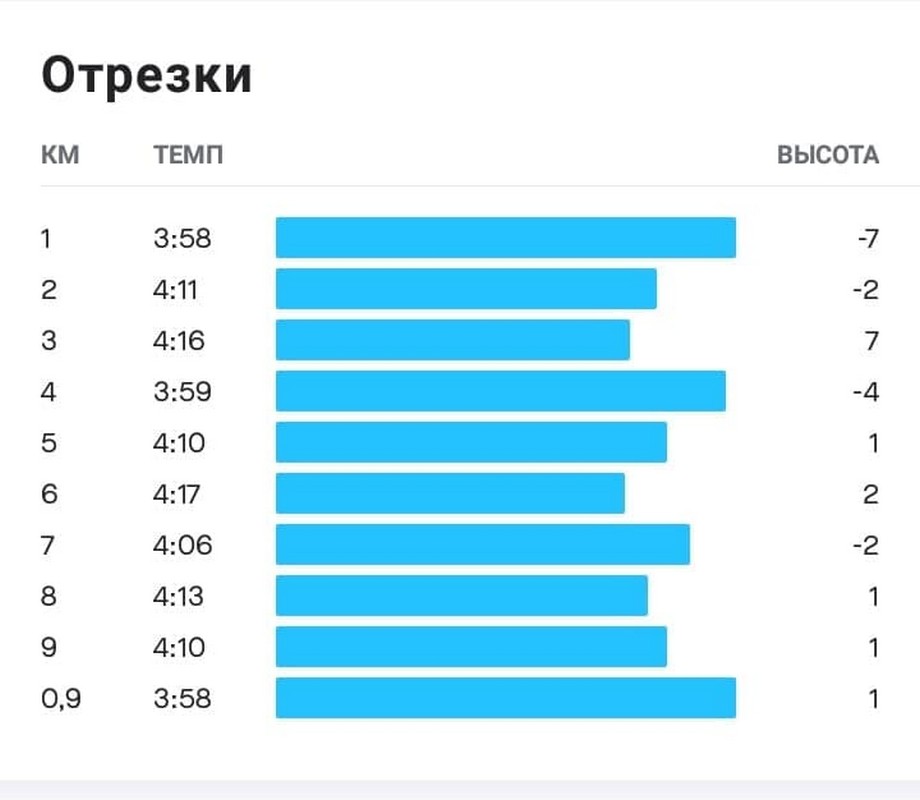 Через 800 посмотрел на часы — 3.48 — слишком быстро, испугался, что перегорю и завалю концовку. Стал притормаживать себя и следующие метров 600 шёл горячий внутренний диалог. Что делать? Бежалось легко и хорошо, но так всегда на старте. Решил пока сильно не замедляться и посмотреть на ощущения после предстоящего тягуна. Бегу как бегу, плевать на план тк уже треть дистанции прошёл. На шестом километре в горку бежал тяжело, прокралась мысль » Ага, а я говорил, завалишь всё. Зачем так быстро начал.» Но горка закончилась и пологий спуск выдул эти мысли прочь. Часы пропищали, что 6 км я пробежал в темпе 4.09. Ой-ой-ой. Оставалось 4 км. Побежал стараясь не смотреть на часы, дабы не вспугнуть. К 8 км опять тягун — тяжело. Оставалось 2 км и пришло время терпеть. Чтобы отвлечь себя стал прикидывать финишное время. Считать на 9 км получалось плохо, но выходило 42.30. С математикой на высоком пульсе тяжело и я ошибшся в подсчетах. Но результат меня устраивал меня более чем. Последние метров 50 уже бежал так быстро как мог в попытке выиграть секунду. Часы прожужжали финиш. Посмотрел время — 41.18.6 Такого я не ожидал. Сбросил 4 минуты с предыдущего забега 2018. Отличный результат для этого года, который в первую очередь стал возможен благодаря разумной и взвешенной подготовке. Тренировка по плану безусловно сделала своё дело.