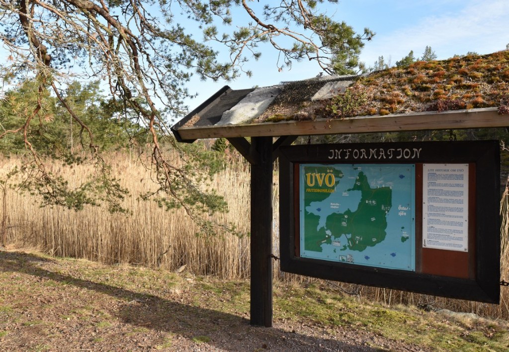 Ö — последняя буква шведского алфавита. Она же обозначает — остров. Целое слово и всего одна буква. Так вот я приехал на остров Uv ранним утром. Перед мостом на остров стоит информационный стенд с картой и кратким описание его истории. Тропа на острове приятная, прогулка заняла около часа. Мест для стоянки с палаткой максимум пара с северной стороны, но есть удобные скалы у воды где в теплые деньки можно отдыхать. Встретил пару рыбаков, но клёва не было. На острове есть маленькое болотце, которое разнообразит пейзаж и растительность. В целом для прогулок выходного дня остров хорош.
