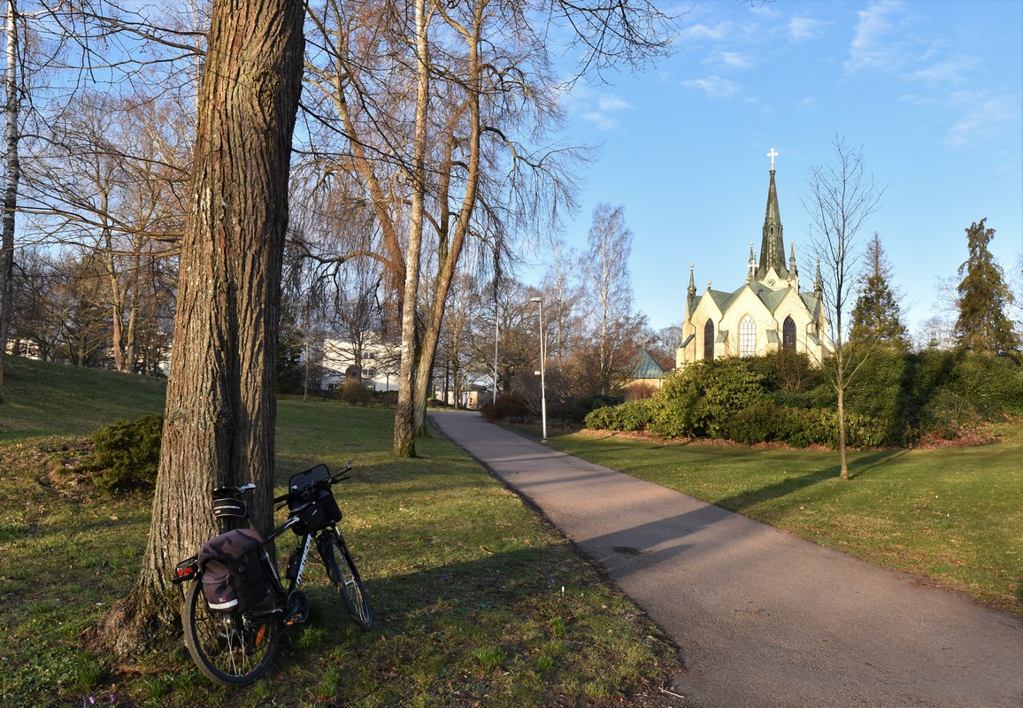 Сухие цифра поездки следующие — 61.4 км, время в седле 3 часа 15 мин, набор высоты 510 м, потеря 500. Общее время поездки с фотопаузами и чаепитием — 4 часа 45 мин. Данный маршрут нашёл на карте местного туристического бюро. Откорректировал только начальную часть, чтобы проехать мимо трех церквей построенных в разное время. Архитектурный стиль разнится, но вот внутреннее убранство осмотреть не удалось. Церкви открываются только в 11 часов , а я выехал около 7 утра. Покрытие было процентов на 70 гравийное, но потрясающего качества. Только последние 4 км были не приятные из-за крупной и рыхлой щебенки. Был всего один довольно крутой подъём, на котором пришлось попыхтеть. Заехав в лес обнаружил, что ночью припорошило слегка снегом траву и ветви елей. Из животного мира встретились пара ланей и орёл медленно взлетел с вышки для охоты. За всю поездку встретил лишь четыре машины. Проехал дистанцию как-то слишком быстро. Стоит повторить, но теперь в обратном направлении.