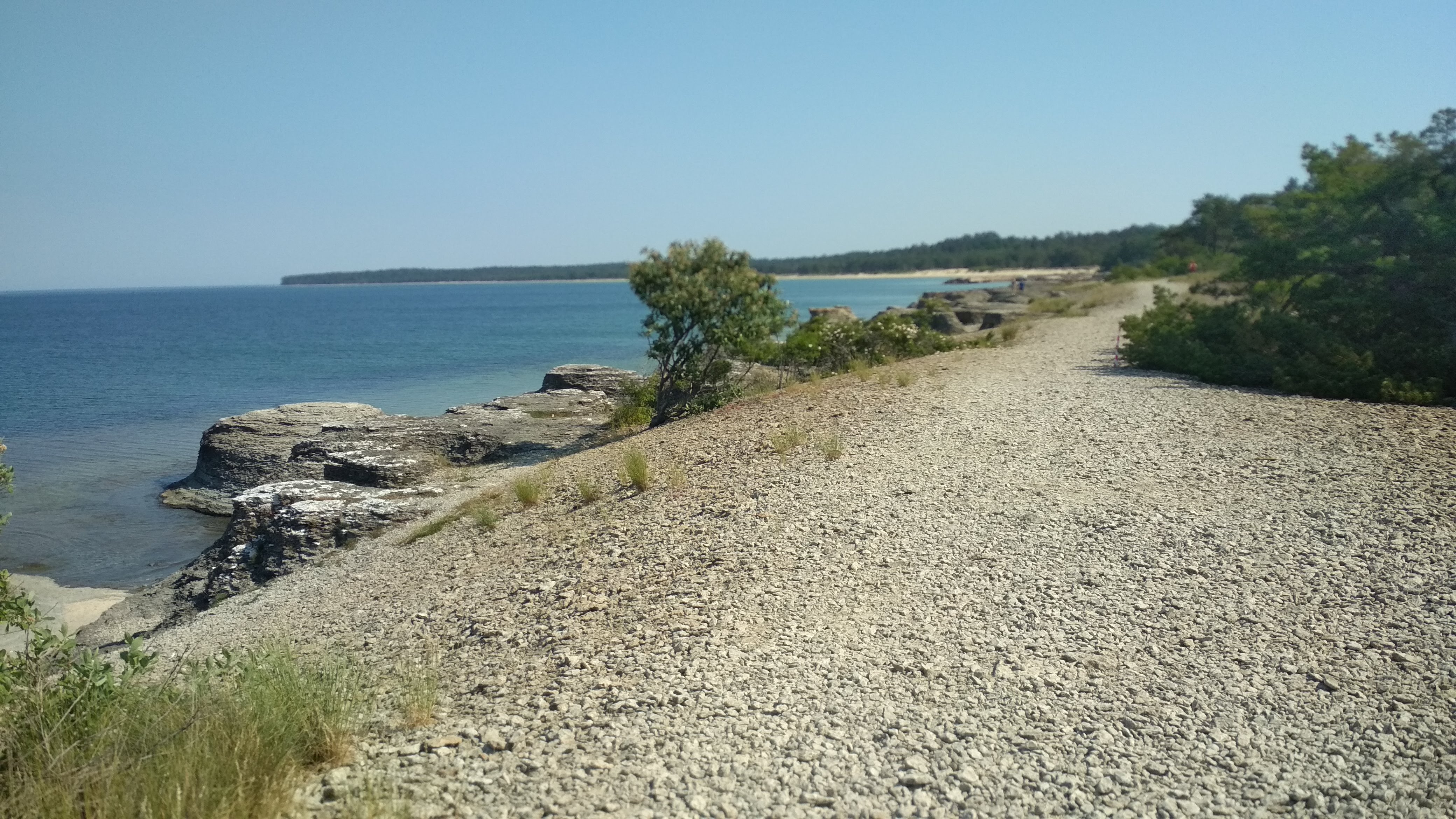 Всё теперь вдоль берега. Этот участок, как и в прошлом году сковорода. Нет ветра, почти нет тени, примерно четыре километра асфальта и ещё одиннадцать километров песчаных или каменистых троп. Места невероятно красивые, но выпивают из бегущих все соки. Темп держал, и впереди замаячили убежавшие на старте от меня спортсмены.