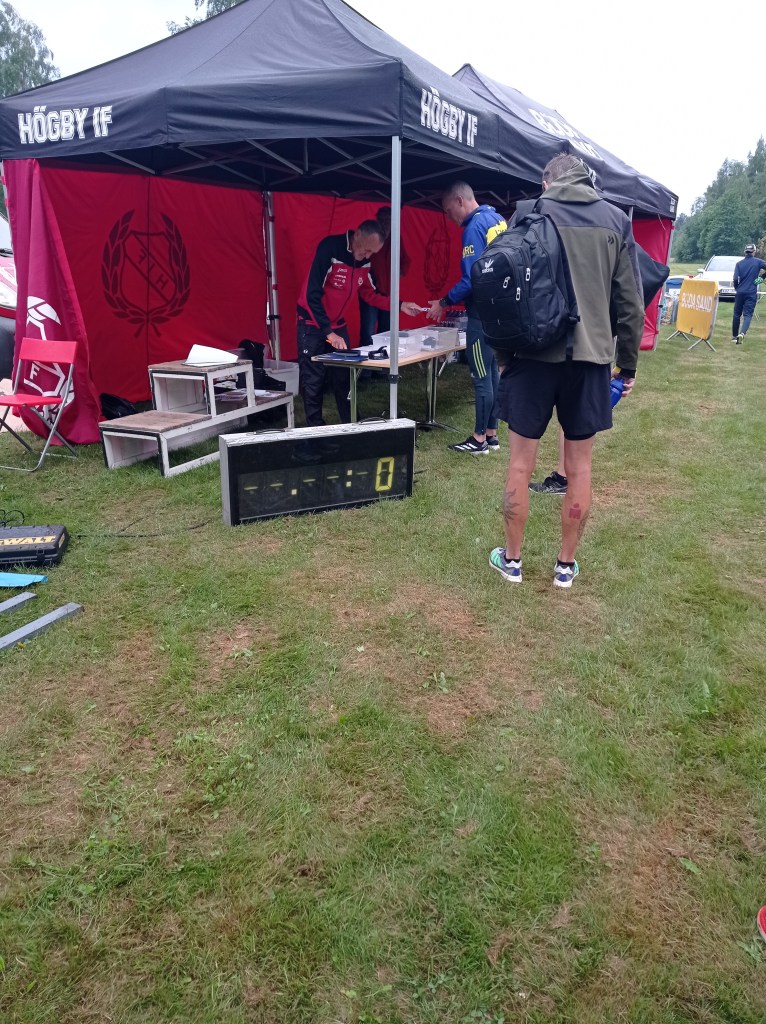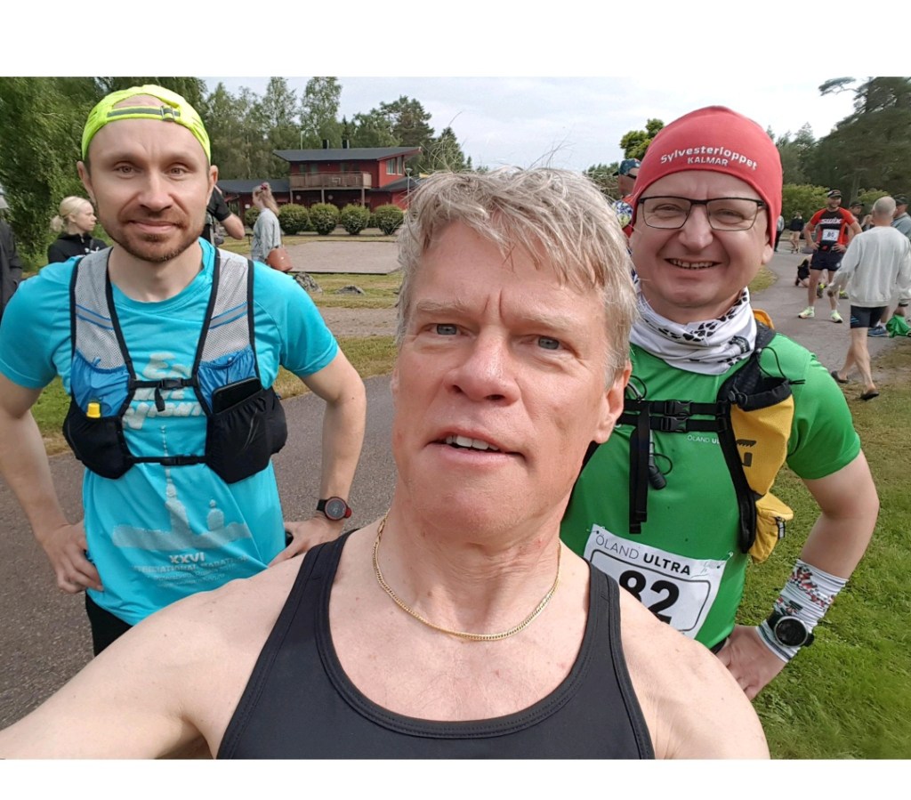 Вернувшись к машине, очень быстро переоделся, засунул гели в рюкзак. Пару минут поразмышлял, но остался в футболке. Майку — алкоголичку решил не использовать. Хотя сомнения были. Пошёл к старту. Там встретил Torbjörn Westman, моего онлайн знакомого скрипача. Мы живём в паре сотен метров друг от друга, и пытались много раз пробежать совместную тренировку, но не складывалось. Вот тут встретились. Тут же был Lukas. Сделали совместное фото перед стартом.