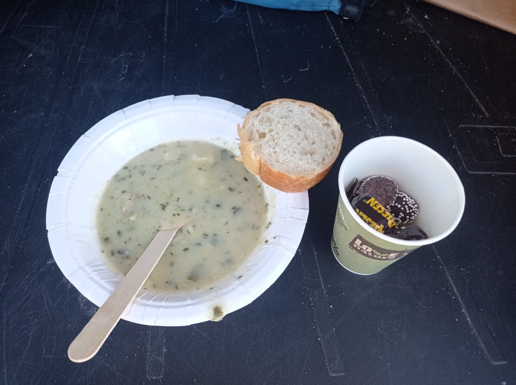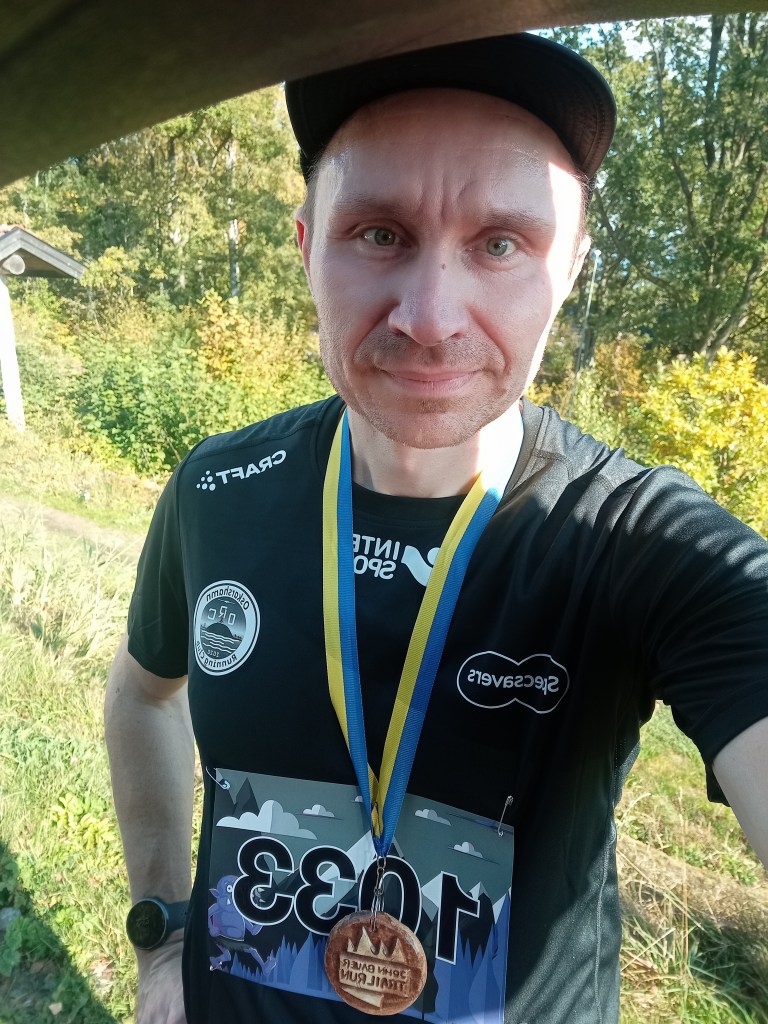 Получил медальку. Встретил парня, с которым бегали в прошлом году Gränsö trail. На финише предлагали два вида супа (взял грибной) и стакан конфет.