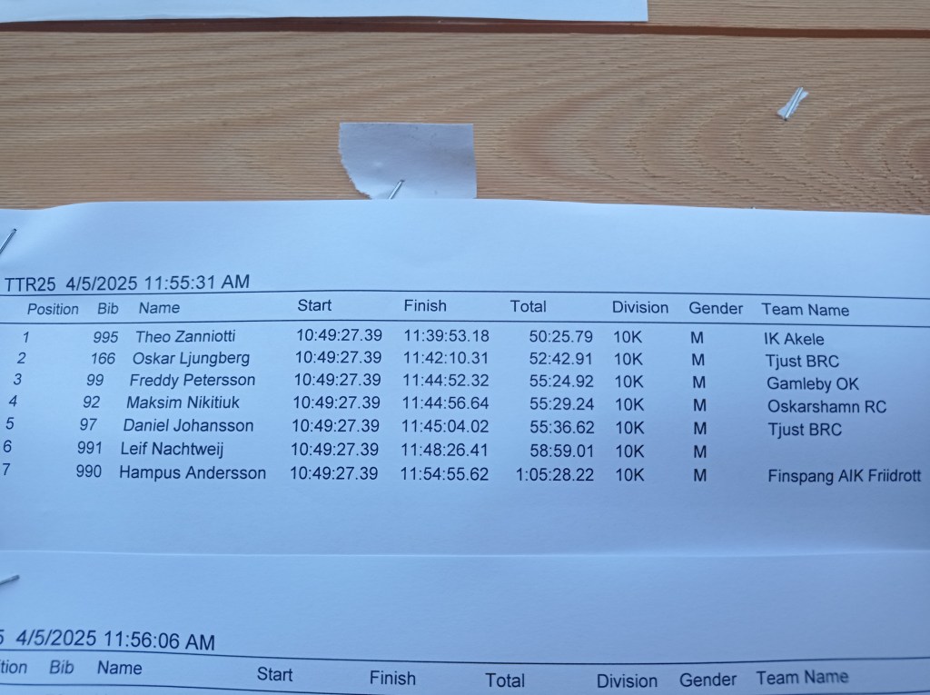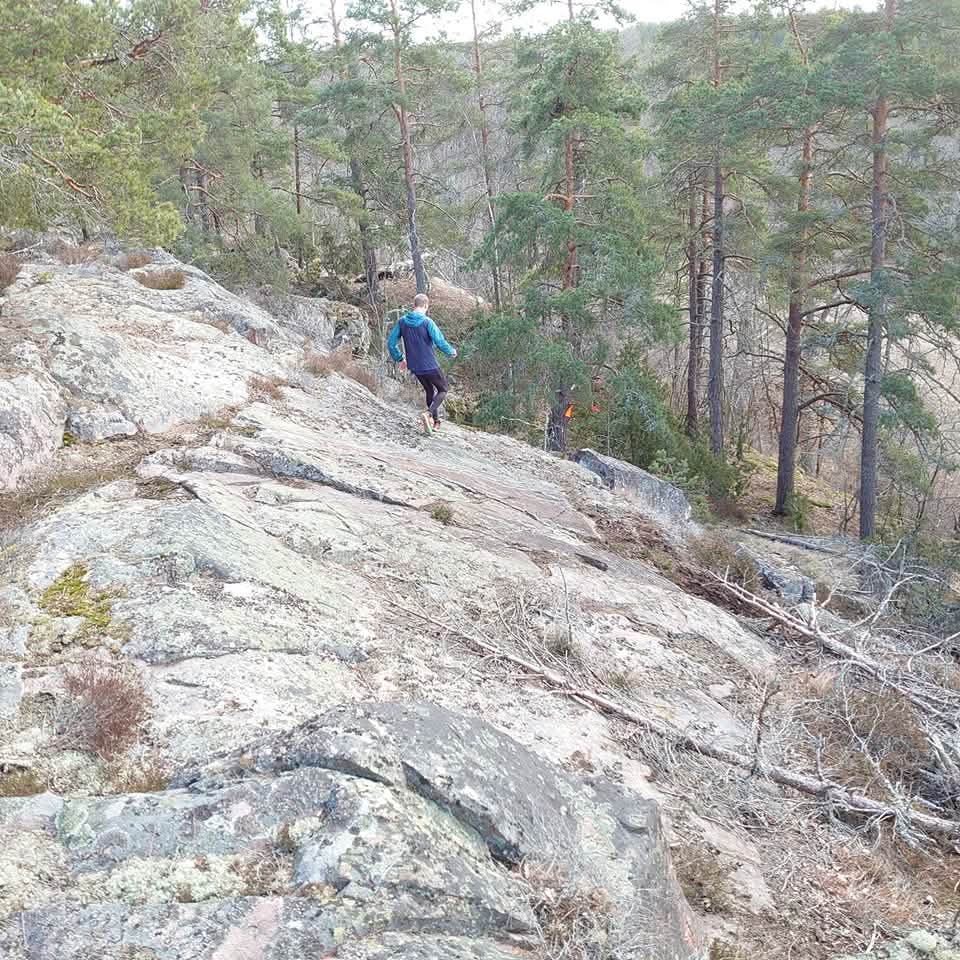 Примерно с третьего километра группу стал тащить я. Бежать в голове группы я не люблю. Если бежишь быстро на высоком пульсе, то становится тяжело отслеживать маркировку и то куда и как ставишь ногу, а это чревато (особенно если ты Буратино). Короче говоря идет дополнительный расход энергии и концентрации. Бежали плотной тройкой и было видно, что темп всех устраивает. Тем не менее к шестому километру я оторвался метров на 40-50, но мне никак не удавалось исчезнуть из поля зрения преследователей. Как известно, если тебя не видят, то хороший шанс, что уже и не догонят. Я же, оторвавшись, потерял тропу и свернул не туда. Пока вернулся, меня нагнали. И опять бежим втроём — пыхтим. Постепенно один из нашей компании стал отваливаться. Трио превратилось в дуэт. На восьмом километре на паре спусков, я сделал ускорения в надежде оторваться, но соперник поддержал. Кстати о сопернике — мы заочно знакомы. В 2023 я взял второе место, а он третье на дистанции 8 км Gränsö trail. Так что мы оба понимали с кем имеем дело. Тем не менее к концу 8 км я опять ушёл чуть вперёд. Надежда затеплилась, но не тут-то было. Опять ошибка в навигации и теряю свой отрыв. Затем последовал участок каменных блоков по которым и между которыми надо было бежать и короткий, но крутой подъём на скалу. Здесь уже мой визави попытался убежать, но я поддержал. После этого нам обоим стало ясно, что разбираться будем в конце. Сил на ускорения в лесу уже ни у кого не было.